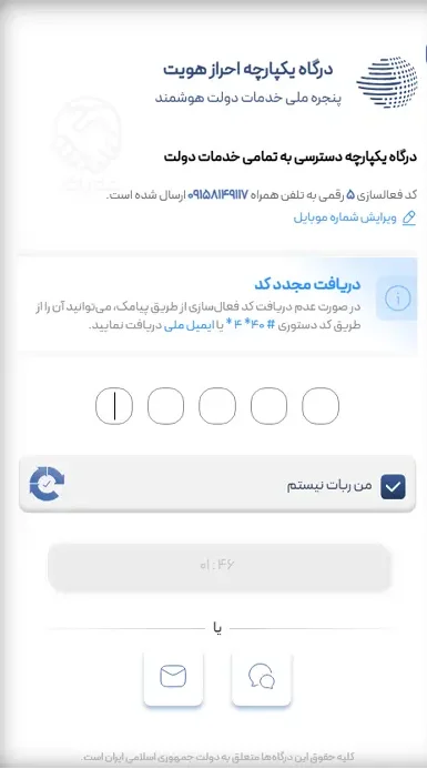 📌 نکته مهم این روش: درگاه دولت من معمولاً برای این است که مطمئن شود خودِ فرد صاحب کد ملی در حال ورود است؛ بنابراین همخوانی کد ملی و شماره موبایل در این مرحله خیلی مهم است.