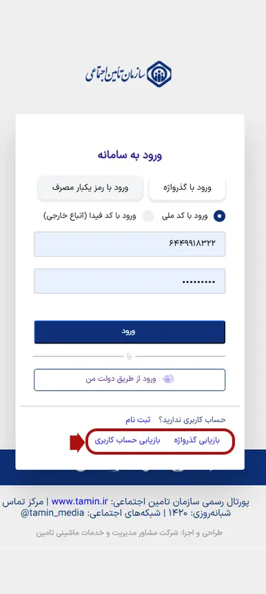 اگر قبلاً در سامانه تأمین اجتماعی حساب ساخته‌اید، ساده‌ترین راه این است که در صفحه «ورود به سامانه»، گزینه ورود با کد ملی را انتخاب کنید و: